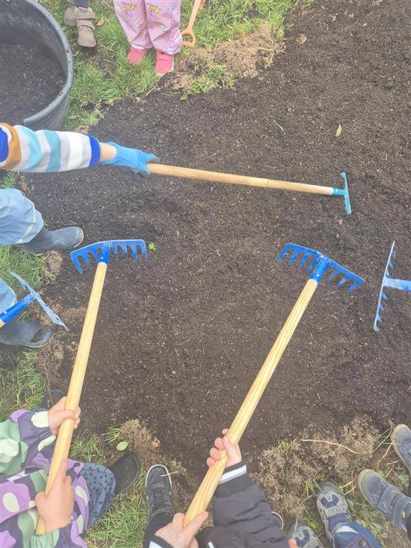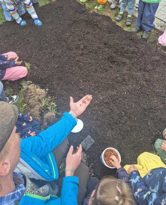 Unsere Familien waren aufgerufen Saatgut von zuhause mitzubringen, einige kleine Samentütchen haben so ihren Weg zu uns in die Kita gefunden. Florian Kleinschroth und Team haben das Beet für unsere Mini-Obstbaumschule im Garten vorbereitet und bekamen anschließend tatkräftige Unterstützung von unseren Kindergartenkindern. Gemeinsam haben sie Erde ins Beet geschaufelt und danach die unterschiedlichsten Samen in die Erde gesteckt. Die Kinder hatten Nüsse, Apfel und Zwetschgenkerne dabei und malten sich schon beim Säen aus, wie groß die Bäume werden, die daraus wachsen sollen.