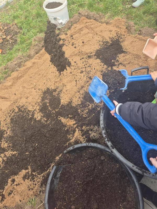 Nach dem Säen muss das Beet nun noch vor Samenräubern, wie Vögeln, Eichhörnchen oder Mäusen geschützt werden. Dafür wurden eifrig Eimerchen mit Sand gefüllt und dieser auf das Beet aufgetragen, ehe die Kinder im Garten ausgeströmt sind, um Laub zu sammeln, das ebenfalls auf das Beet gelegt wurde.