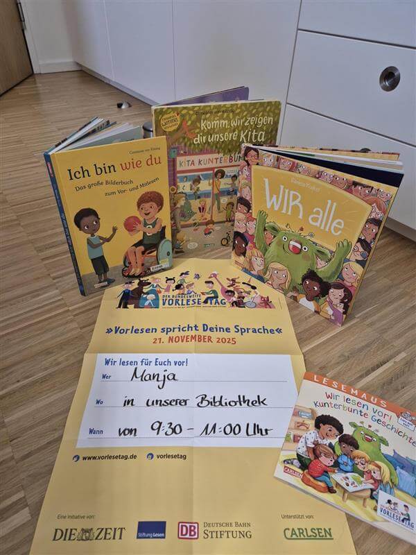 Am Bundesweiten Vorlesetag, Donnerstag, 21.11.2025 treffen wir uns in unserer Kindergartenbibliothek zum gemeinsamen Lesen und Schmökern. Gemeinsam Bücher zu betrachten hilft dabei, die Freude an Sprache zu wecken, den Wortschatz zu vergrößern und die Fantasie anzuregen. Nach dem gemeinsamen Lesen wartet auf jedes Kind eine kleine Überraschung.