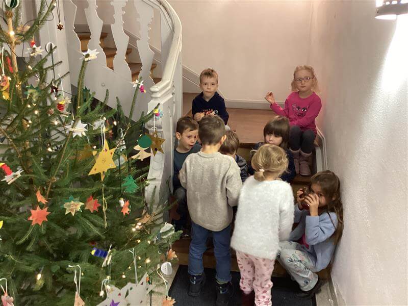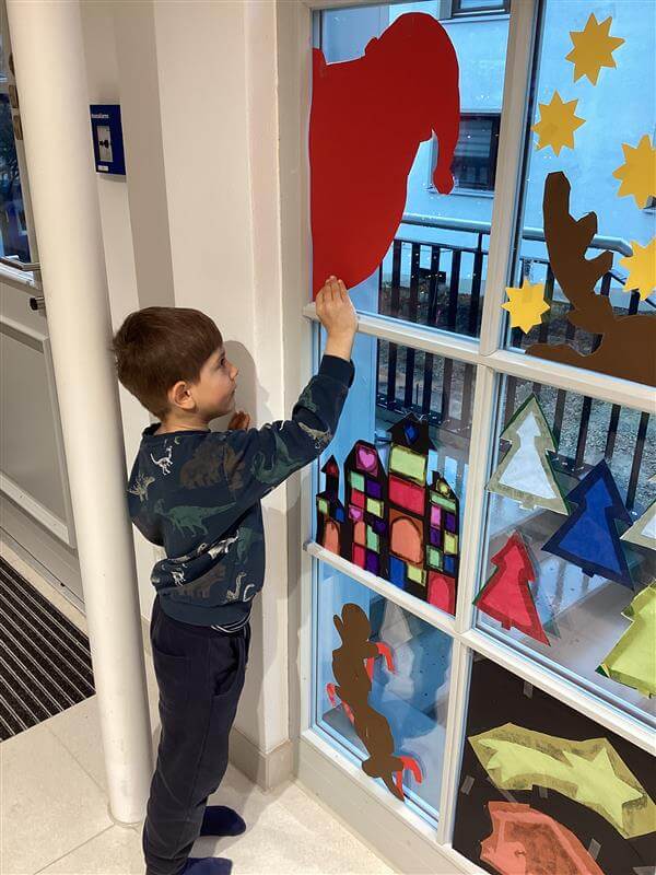 Auch das Bernatura wurde von den Schlauen Marienkäfern mit weihnachtlicher Dekoration beliefert. Die Sprossenfenster im Eingangsbereich, 24 an der Zahl, sollten zum bunten Adventskalender werden. Mit Ton- und Transparentpapier fertigten unsere Vorschulkinder Fensterschmuck an und schmückten damit die Fensterfront des Bernatura.