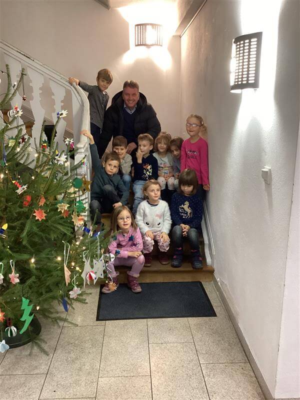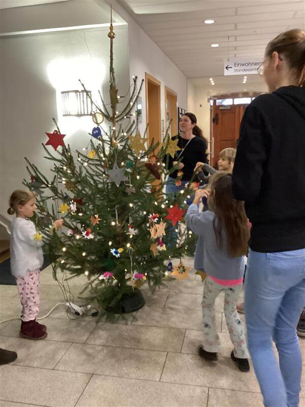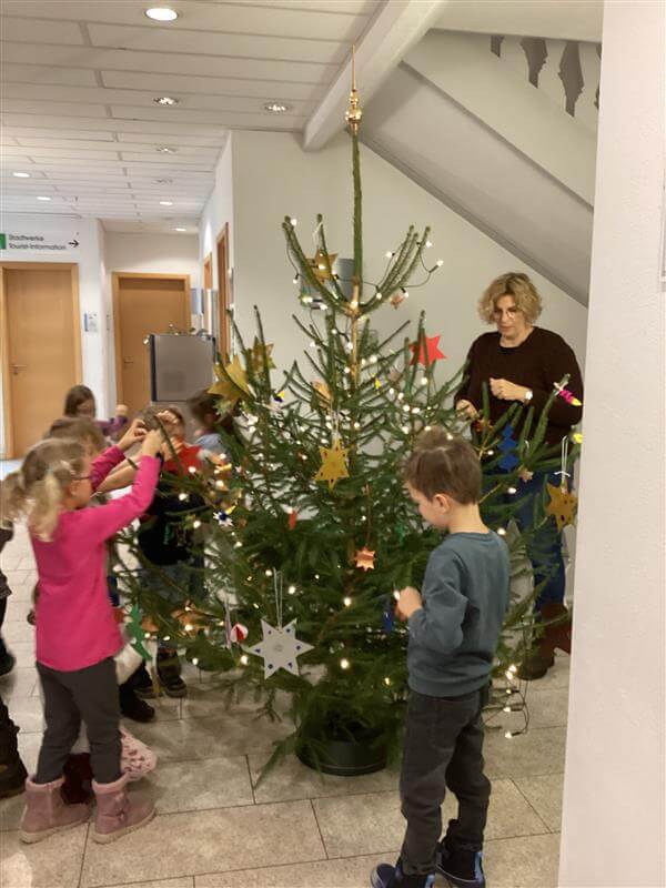Bürgermeister Schwarz und die Mitarbeiter im Rathaus freuten sich über den nun bunt geschmückten Baum. Und die Kinder freuten sich über eine Stärkung mit leckerem Punsch und bunten Plätzchen.