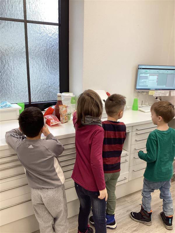 Unsere „Schlauen Marienkäfer“ waren eingeladen die Zahnarztpraxis Paulus-Berberich zu besuchen. Dort lernten sie, dass manche Lebensmittel den Zähnen schaden und vor allem Zucker ganz schlecht für unsere Zähne ist. Die Kinder haben gestaunt, als sie gesehen haben, wie viele Zuckerstücke in Nutella oder Ketchup stecken. Im Anschluss daran durften unsere Vorschulkinder sehen, wie Karies einen Zahn kaputt macht und wie die Zahnärztin mit Bohrer und Füllung den Zahn retten kann.